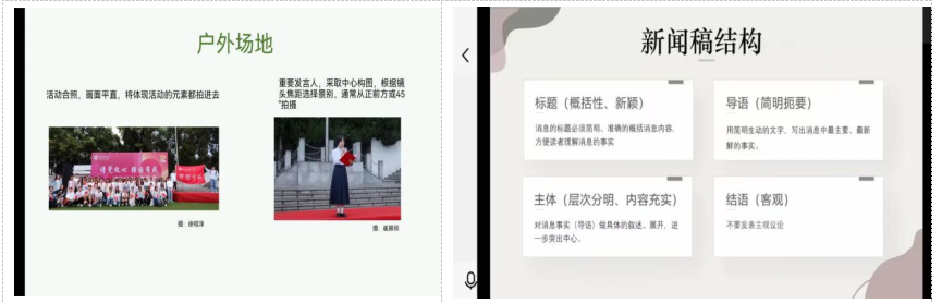 接着,王榆佳围绕新闻稿的性质和写作原则,讲解了新闻稿概念、新闻稿结构、新闻稿报审流程,并进行了新闻稿的实操训练。她向同学们介绍了新闻稿写作中的一些格式规范要求以及注意事项,逐层为同学们讲解了新闻稿撰写的知识和技巧,并为同学们推荐了相关的公众号和APP。
