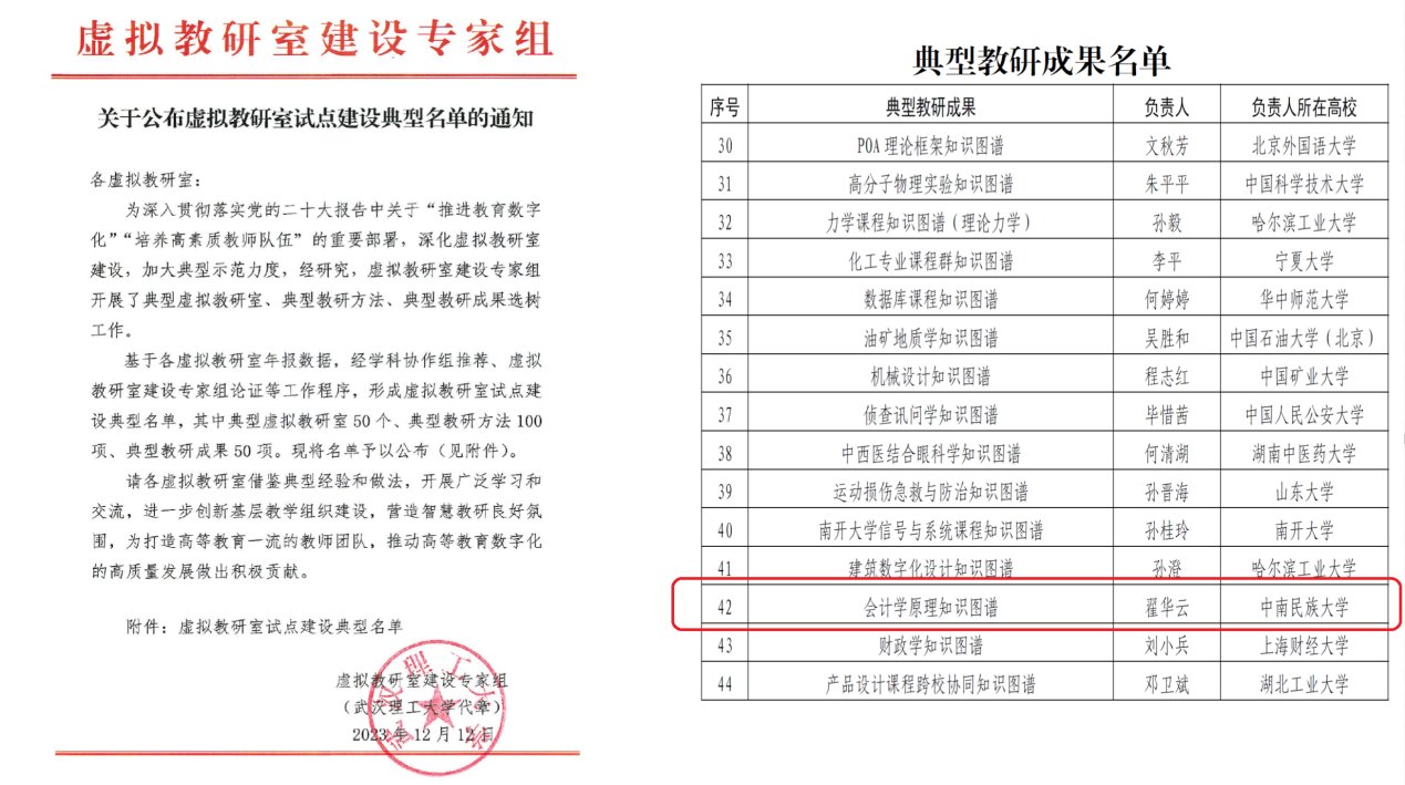 为贯彻落实教育“十四五”规划,深入加强虚拟教研室建设,进一步巩固建设成效,12月23日,2023年虚拟教研室建设研讨会在武汉成功召开。教育部高等教育司副司长高东锋,虚拟教研室建设专家组和秘书处成员、协作组组长代表,以及有关虚拟教研室代表共200余人参加了会议。会上,威尼斯官网民族院校会计学虚拟教研室的“会计学原理知识图谱”建设入选全国典型教研成果名单,该奖项全国共50名。