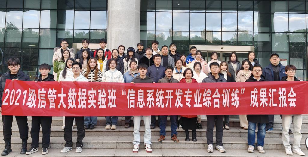 2023年12月25日下午,管理学院信息管理与信息系统专业于16栋教学楼103实验室成功举行了2021级大数据实验班实训成果汇报会,本次汇报会主题为2021级信管专业大数据实验班“信息系统开发专业综合实训”的项目发布、成果汇报、评优暨结业典礼。汇报会由陈谦、侯鹏辉同学担任主持人,全体2021级大数据实验班同学参加,参会的领导和老师有管理学院杨单、杨健、杜文华、马林茂老师以及实训合作企业武汉凡诺芯科技有限公司指导教师欧阳旻、黄民智、雷锦辉老师等。
