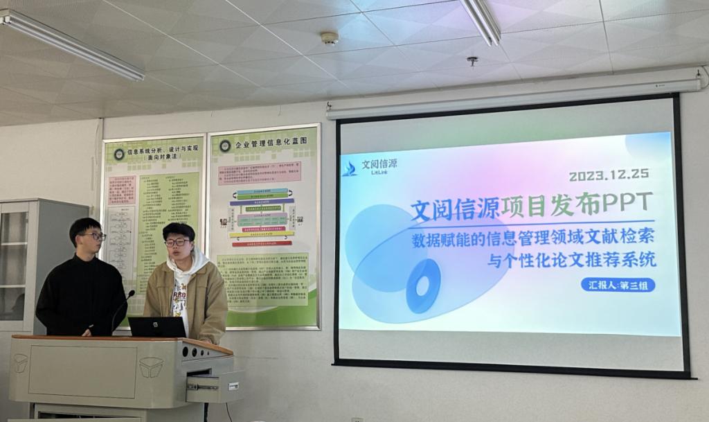 汇报会上,首先由各小组依次进行项目成果展示和汇报。此次实训汇报有七个团队开发的七个项目:AMITY同行(社交平台)、雅集(古诗词学习交流平台)、文阅信源(数据赋能的信息管理领域文献检索与个性化论文推荐系统)、聆心(在线心理咨询服务平台)、非遗梦工厂(交互式非遗传承与宣传平台)、BeatHub律动社(音乐交流平台)、Mega One(在线心理咨询服务平台)。每个项目小组分别从项目简介、人员分工、业务展示、团队感想等方面展开汇报,与会的老师们对各个小组的展示进行评分,在展示结束后根据各小组的分数进行排名选出三个优秀项目。
