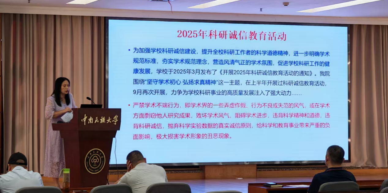 此次活动中,副院长周运兰教授首先阐释了科研诚信的含义,指科研工作者在科学研究中恪守真实性、原创性和公正性的行为准则,涵盖学术不端防治、伦理责任履行等核心规范,是科学研究的基石。其次重点解读了学术不端行为的界定与危害,强调严禁弄虚作假、剽窃成果等违背科研诚信的行为;最后引导全体教师坚守学术底线,深化科研诚信意识,凝聚共建诚信的合力,营造风清气正的学术氛围。