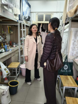 (周运兰(左一)走访22栋学生宿舍 柏舒庭摄)