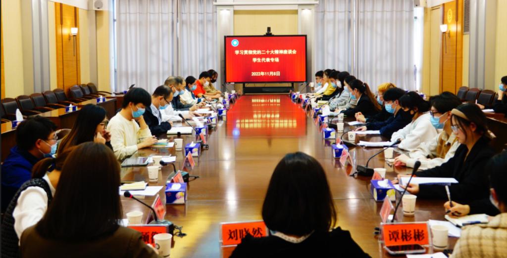 习近平总书记在党的二十大报告中强调,广大青年要坚定不移听党话、跟党走,怀抱梦想又脚踏实地,敢想敢为又善作善成,立志做有理想、敢担当、能吃苦、肯奋斗的新时代好青年,让青春在全面建设社会主义现代化国家的火热实践中绽放绚丽之花。为掀起青年学子学习贯彻党的二十大精神的热潮,11月8日下午,学校在学术交流中心召开学生代表学习贯彻党的二十大精神座谈会。校党委副书记、副校长宋发军,党委学生工作部主要负责人,全校本预科、硕士和博士研究生代表23人参加了会议。