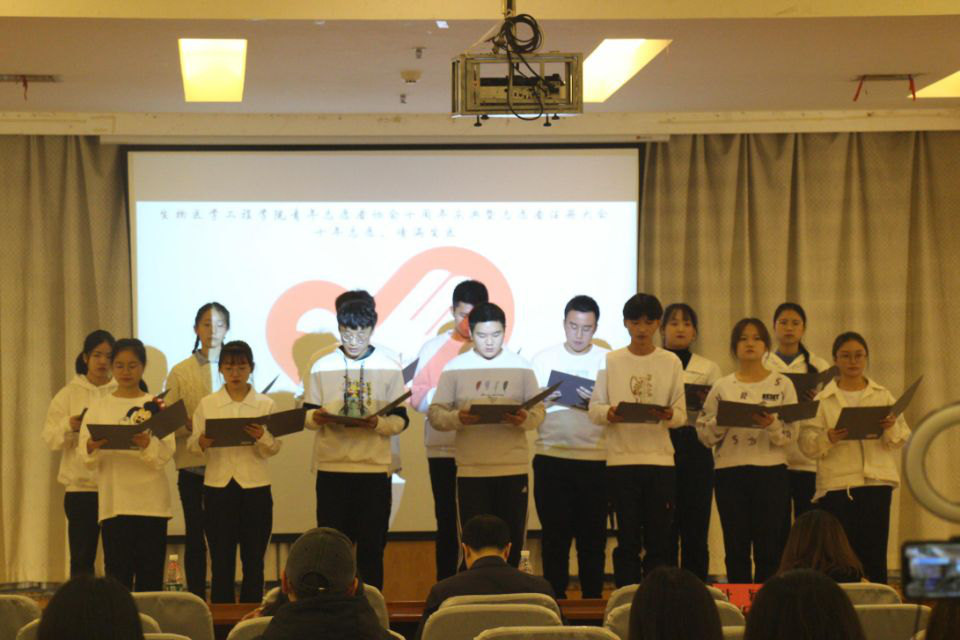 全体工作人员合影 学院团委志工部部长兼青协主席谭英对学院青年志愿协会进行介绍,并与大家一起回顾了生医青协不断成长和壮大的十年。上一届生医青协主席郑卫民分享志愿服务经验,对新一届青协成员提出了努力学习文化知识、发扬志愿者精神的希望。 随后,学院文工团带来了歌曲《奉献》,青协志愿者表演了手语节目《追光者》、《平凡天使》和诗朗诵——《爱心无限,志愿同行》。