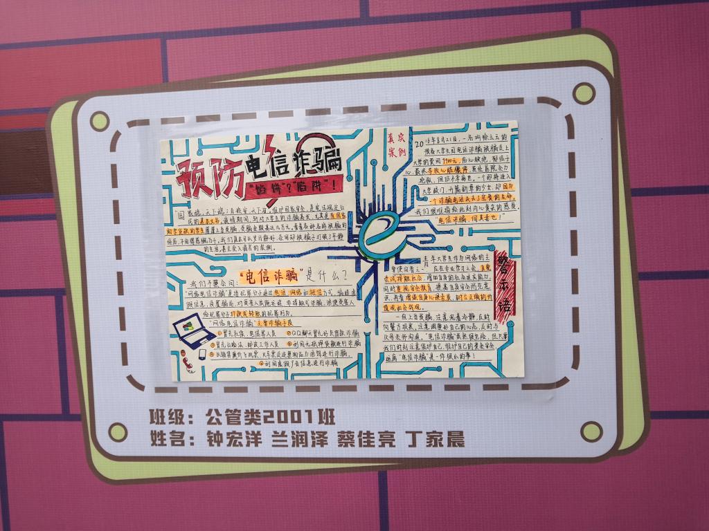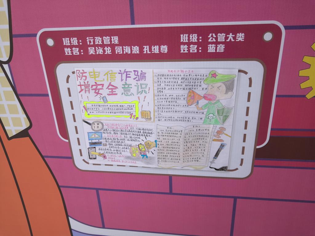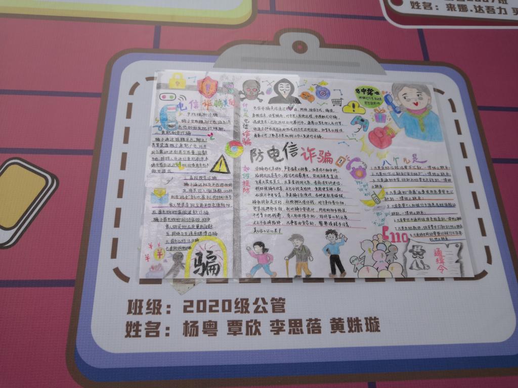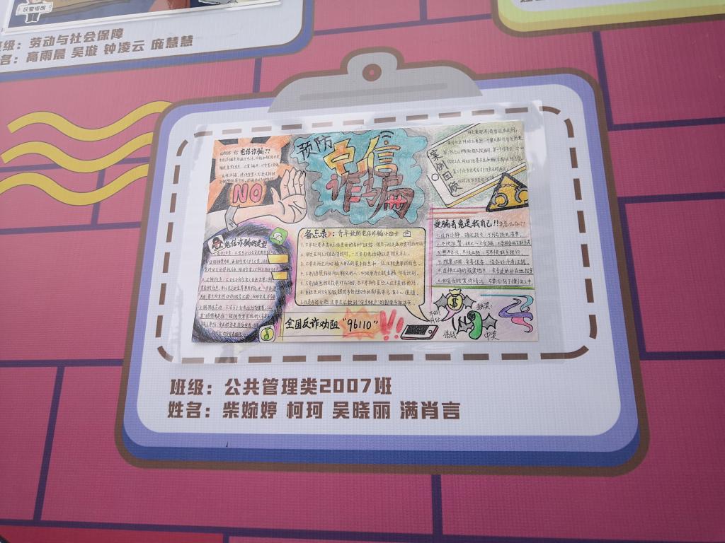 为了深入开展预防电信诈骗宣传教育活动,切实维护学生合法权益,公共管理学院举行了预防电信诈骗手抄报比赛,同学们积极参与,最终有30多个作品脱颖而出。同学们的作品都别具特色,充分体现着广大同学的个性和智慧,评审工作结束以后,所有作品都集中进行展示,目前在15号教学楼下,吸引了许多师生驻足观看,同学们纷纷表示这种形式很吸引人,同时也很有创意,加深了自己对预防电信诈骗活动的理解。