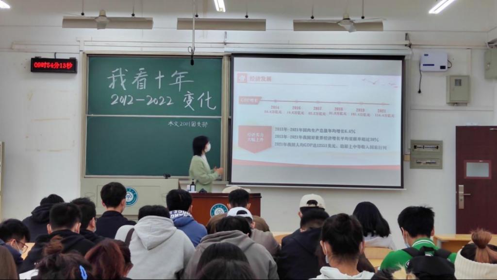忆往昔风雨兼程岁月如歌,看今朝改天换地风华正茂。站在历史的今天,我们以赤诚之心,紧紧跟随党的脚步……水文2001班“我看十年变化”班团会紧扣“变化”二字展开,从“科创发展”“经济发展”“绿色发展”三个方面展开,勾勒出党的十八大以来中国发展的历史性、整体性、格局性的重大变化。资源2001班主题班团会在团支书的主持下,细数这十年来的伟大飞跃,重点歌颂伟大的脱贫攻坚事业,深刻学习脱贫攻坚工作者无私奉献、爱党为民的高尚精神。环科2101班主题班团会对“政治”“经济”“体育”“军事”四个方面做出总结,主要展现我国十年来的巨大变化和国际地位的提升,激励全体同学跟随党的领导,再创光辉前程。资环2206班主题班团会以“我眼中的变化”为主线,由全体同学依次分享自己眼中十年来的变化,娓娓道来,情真意切,信任感、幸福感、自豪感不禁从心底油然而生:这是我们伟大的中国共产党,这是我们强大的祖国!