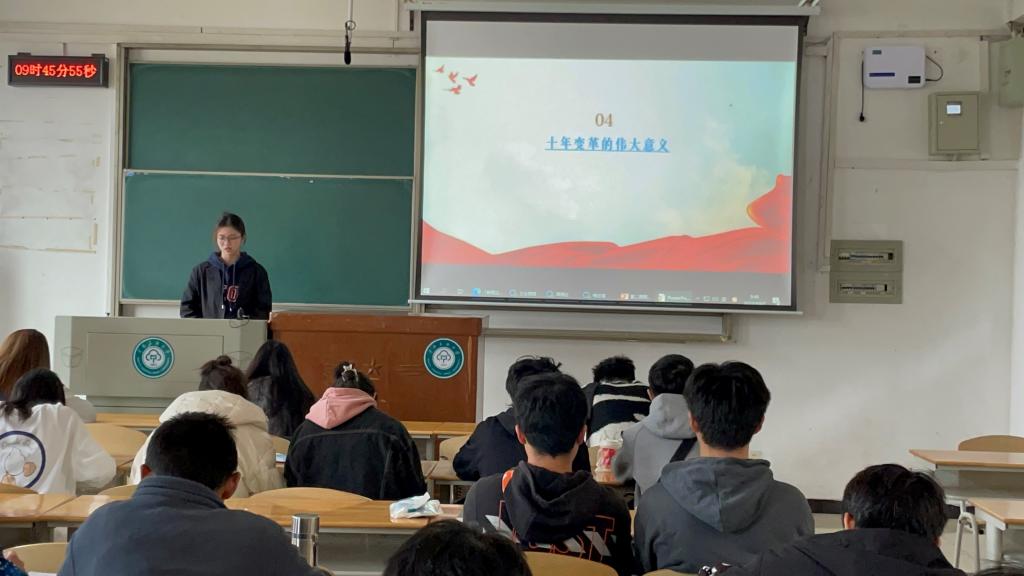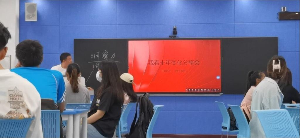 主题班会以图片展示、数据分析、短视频等多种形式向同学们再现了十年来我国在经济建设、脱贫攻坚、文化教育、生态文明等各方面的进步和变化,让同学们感受到了党的十八大以来十年间深耕所获得的辉煌成就。在自由发言中,同学们畅谈近十年来发生在自己身边的变化:从十年前的旧农村面貌谈到现如今的新农村规划;从“绿皮火车”谈到高铁的中国速度;从商场购物谈到直播带货;从十年前教室上课到如今常态化疫情防控下的“云”课堂;从“笔”友、“网”友到微博超话、哔哩哔哩up主……社交媒体的交友模式日新月异,各大数据库也为我们提供了海量在线学术资源,同学们感受到网络与科技的发展带来的变化。
