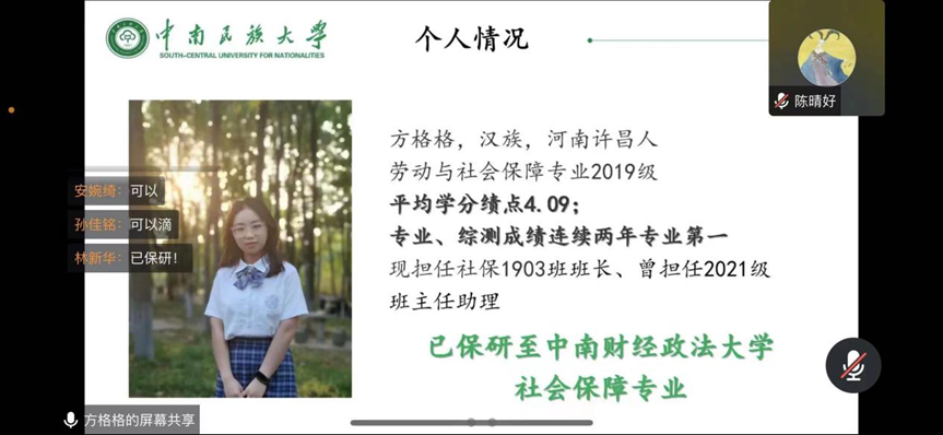 会议接近尾声,2019级的劳动与社会保障专业的方格格同学给大家带来了保研的经历分享,她从本科学习、科研竞赛、工作生活三个方面展开介绍,强调发展兴趣爱好的重要性,干货满满。最后是2019级行政管理专业的马宁同学进行深入浅出的分享,她就如何提高自己的专业成绩的问题展开交流,着重分享了英语的学习方法,向大家传授诸多加强学业、准备竞赛和保研名校的经验。