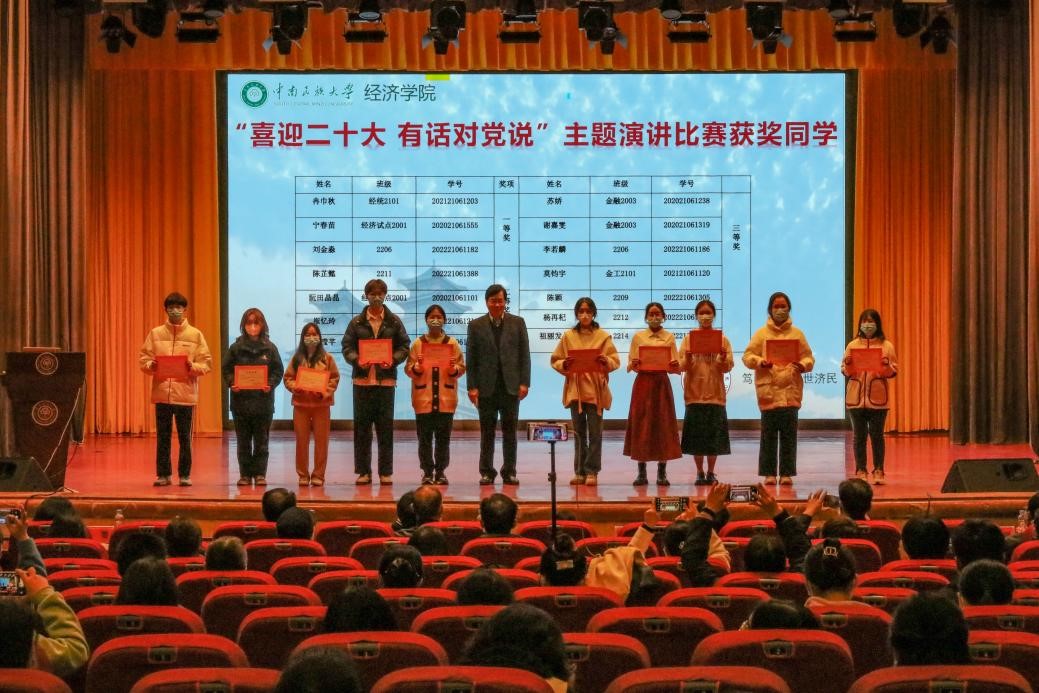 会议播放了“同学共进”计划主题教育成果视频,充分展示经济学院铸牢中华民族共同体意识教育和学风建设成效;邀请学生代表凡诗轩分享大学生生涯规划,体现了2022级新生对“转变角色、找准方向”和生涯规划的深度思考;展示“喜迎二十大 执笔著华章”主题征文比赛优秀参赛作品,并邀请“喜迎二十大 有话对党说”主题演讲比赛获奖学生代表冉巾丘上台演讲,鼓励全体同学坚定不移跟党走,以昂扬精神为党的二十大献上青春礼赞。随后,参会领导和教师为2022-2023学年秋季学期“最美笔记”大赛、2021-2022学年“晚自习联盟”、2021-2022学年“志在同学,愿与共进”学业帮扶活动、2022级大学生涯规划分享活动、“喜迎二十大 执笔著华章”主题征文比赛以及“喜迎二十大 有话对党说”主题演讲比赛获奖学生颁奖。
