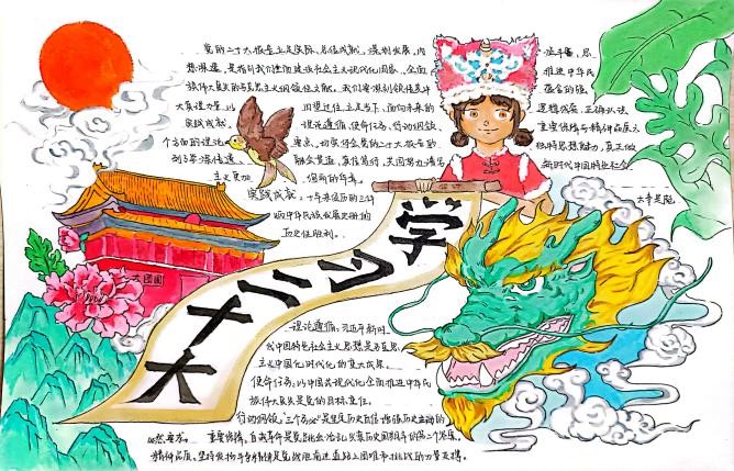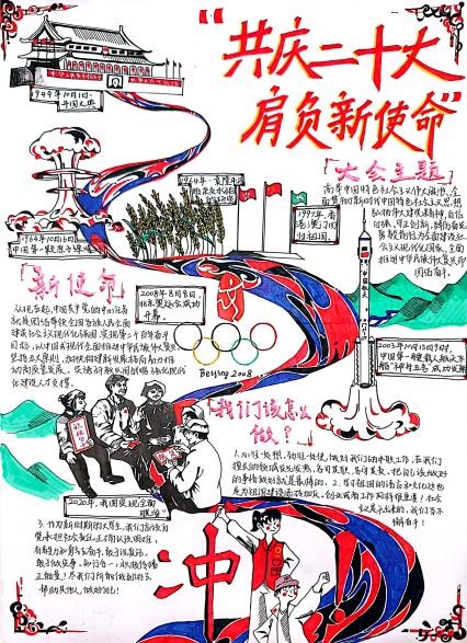 此次比赛共收到近200份作品,同学们以手抄报为媒介分享了研读党的二十大报告、学习党的二十大精神的心得体会,用蜡笔、马克笔、水粉笔、碳素笔等工具描绘出令人憧憬的中国式现代化新画卷。