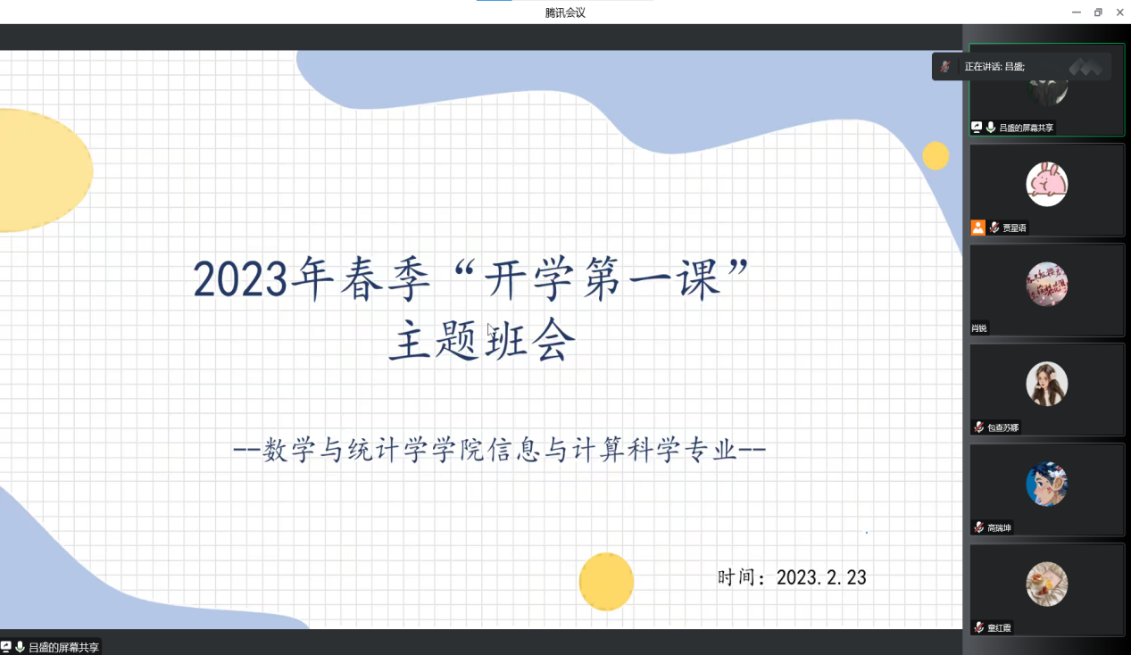 春风浩荡满目新,扬帆奋进正当时。为落实学校开学初相关工作要求,引导学生踔厉奋发迎接新学期,近日数学与统计学学院各班级相继召开《开学第一课》教育主题班会,数学与统计学学院各班级班导师担任《开学第一课》主讲人,因仍有部分学生未返校,此次班会采取线上线下相结合的方式进行。