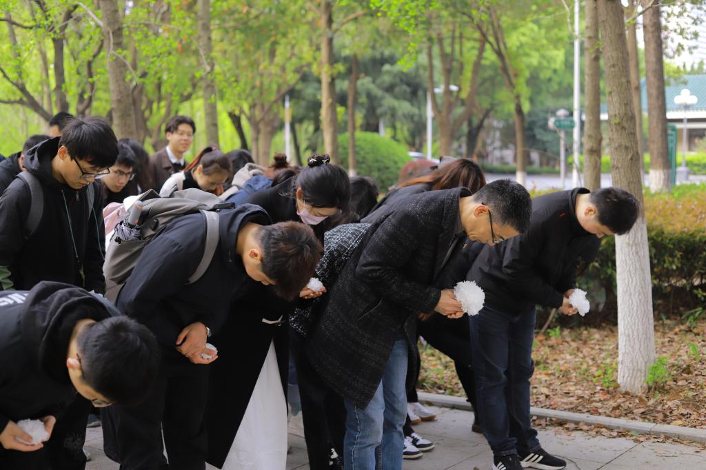 随后,全体成员肃立默哀一分钟,接着师生一道向吴泽霖先生雕像三鞠躬,献上一对花篮和师生们亲手制作的白花,以表达深深感激和无限哀思之情。