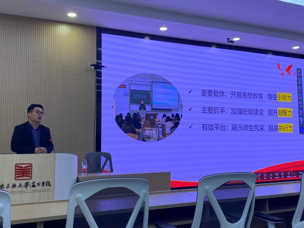 按照美术学院党政联席会议和党委会会议研究制订的2023年度工作计划,为提升全院班导师思政课和主题班团会设计质量,提高班导师开展主题班团会的能力和水平,3月30日14点,美术学院在美术馆报告厅举办了第一期班导师集体备课暨思政教育主题班团会内容设计辅导报告会。马克思主义学院学工办主任、辅导员、班导师金瑶老师应邀做了题为“三全育人背景下本科生班团会的‘思’与‘行’”的主题报告,报告由美术学院党委副书记张雯君主持,美术学院各年级班导师五十余人参加了辅导报告会。
