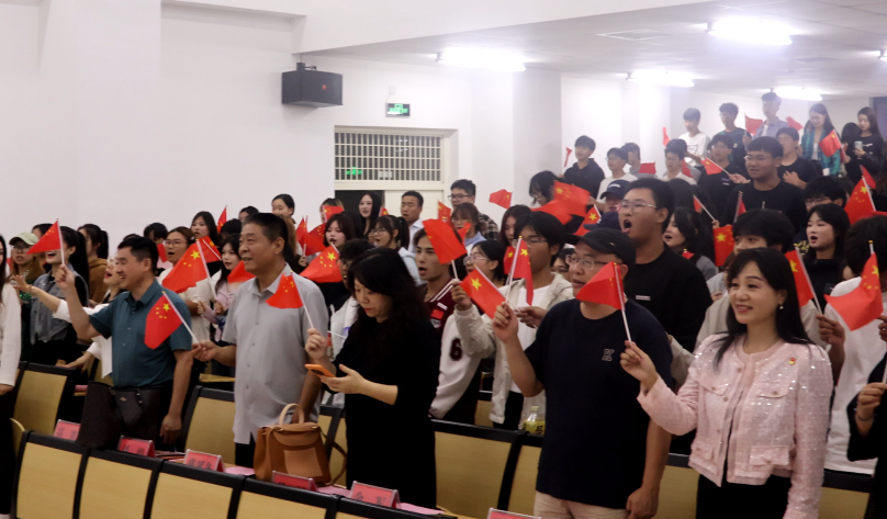 全体师生起立挥舞国旗合唱《歌唱祖国》。 音乐舞蹈学院 供图