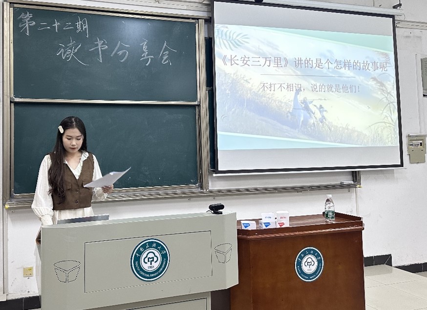 医信2201班付文暄同学分享极具优秀传统文化特色的电影《长安三万里》。她讲述自己被李白、高适两人的深厚友谊所打动,并吟诵了影片中的许多优美诗词,带领大家畅游在诗的海洋里。最后她抒发了自己的观影感想:“我们身为普通人可以平凡但绝不平庸,我们要心系理想,并为之努力奋斗。”