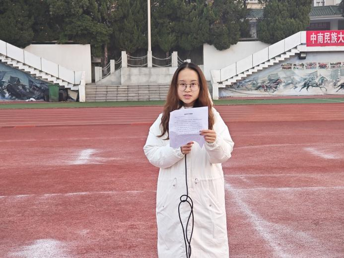 最后,教育学院2021级应用心理学专业学生吴倩以《团结同心共圆梦》为题做发言。吴倩表示,作为民大的一员,我们要像石榴籽一样紧紧拥抱在一起,共创美好未来,我们要始终坚持以铸牢中华民族共同体意识为主线,不断加强政治理论水平,促进各民族交流交往交融。