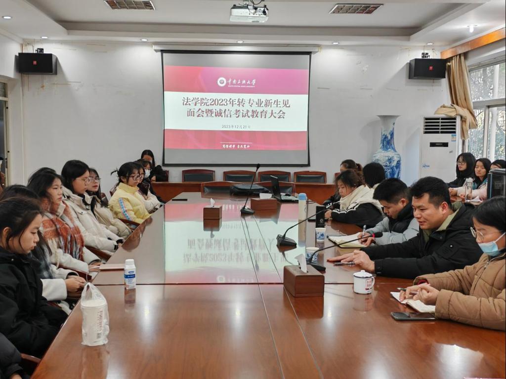 为帮助转专业新生尽快适应新环境,切实做好服务和教育工作,法学院于12月21日下午在学院219会议室召开了法学院2023年转专业新生见面会暨诚信考试教育大会。本次见面会由2023级本科辅导员陶恒老师主持,党委副书记姜珍、学工办主任张利菊、教学秘书吴雪姣及全体2023级转入新生出席。