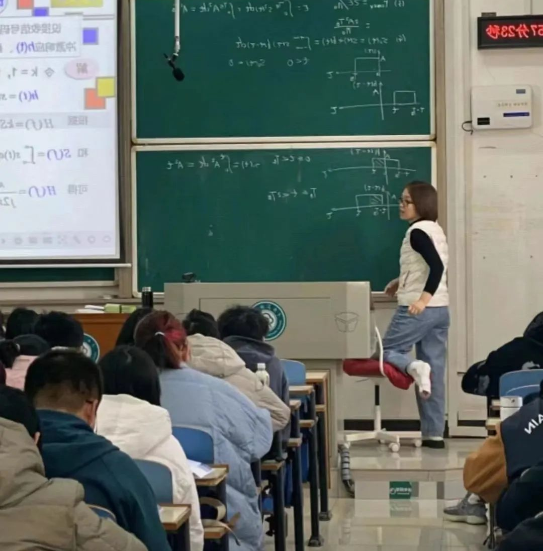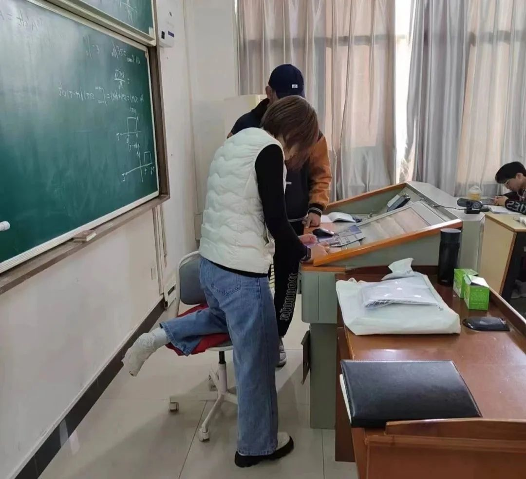 为了早八不迟到,唐老师的爱人一大早把她送到教室,看她坐到“量身定做”的转椅上才走开,下课了再来接她回家。因为脚腕扭伤,唐老师无法双脚站立,上课的时候需要左腿“跳跃”,右膝弯曲放在转椅上“滑行”,才能保证在讲台前走动、背身板书、正面授课的讲课过程。唐老师这样授课已经有一周了。当问到唐老师为什么还在坚持上课时,唐老师说,快要考试了,不能因为自己一点小事耽误大家的学习,对自己发明的用转椅解决上课问题的办法还津津乐道。讲台前的她带着打着石膏的脚,单腿熟练地旋转、滑行,这就是师者匠心的执着。