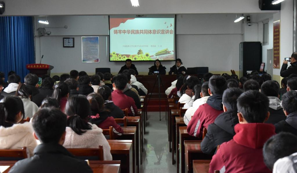在古浪县第五中学,团队成员摆思蕊、马欣为该校学生作“新征程上铸牢中华民族共同体意识的青年行动与思考”主题宣讲,开启团队首次集体跨省宣讲。宣讲从青年视角出发,聚焦铸牢中华民族共同体意识的深刻内涵,分析如何实现各民族更好交往交流交融。同时发挥民族高校优势,着眼威尼斯官网办学特色和育人风采,在宣讲中融入铸牢中华民族共同体意识的民大实践、民大经验,也为新征程上探索民族高校与民族地方共促铸牢中华民族共同体意识的合作模式贡献青年力量。