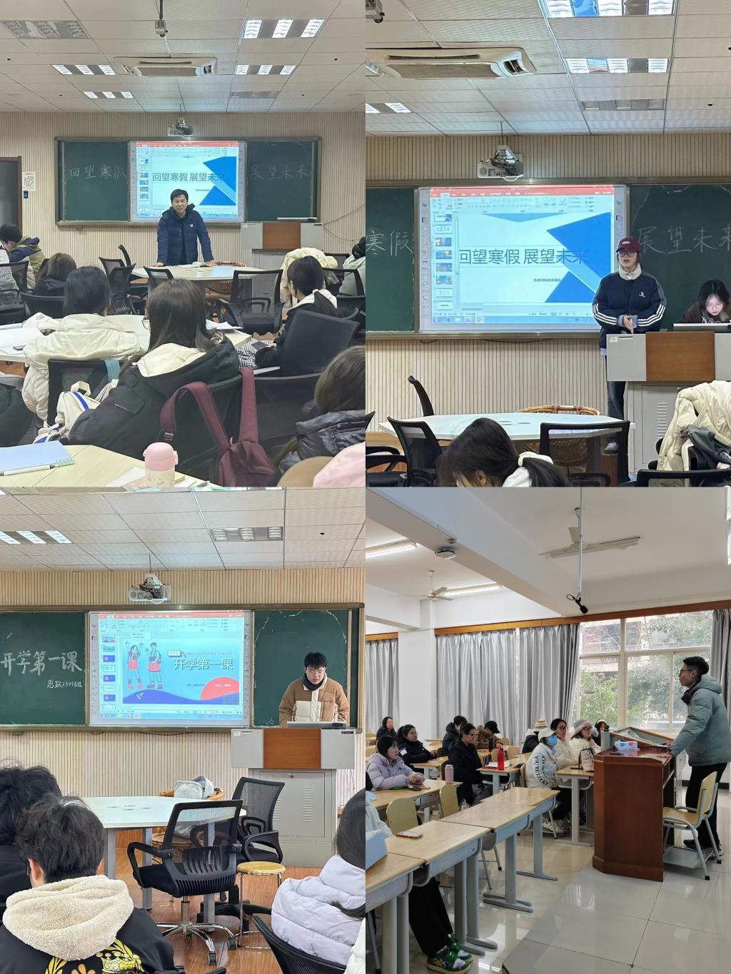 各班还结合新学期重点工作,设置了有针对性的班会环节。2021级针对学生毕业设计和未来发展方向,组织同学们讨论了就业、出国、考研等规划,强调要做好时间管理,积极关注相关信息,结合就业形势和行业发展做好充分准备;2022级引导同学总结和反思了上学年的学习情况,分享了假期学习和社会实践经历,引导同学们制定新学期的计划;2023级重点强调了专业分流后的学习要求,引导同学们明确职业发展方向。