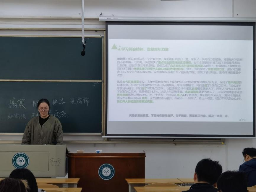 领悟两会精神,汲取前进力量。班会过程中中同学们观看视频,学习习近平总书记的重要讲话精神、学习政府工作报告内容,了解我国过去一年和五年取得的成绩、今年发展的主要预期目标等。环科2101班团支书李钰结合政府工作报告,向大家普及了其中与环境息息相关的时政热点,鼓励大家积极投身生态文明建设,为推进建设美丽中国贡献青春力量。