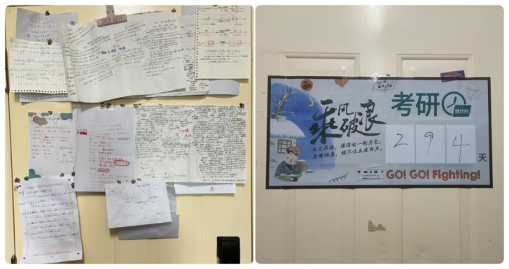 “学霸寝室”背后的是全员朝着同一个方向努力,彼此监督,互相激励。上岸北京协和医学院的刘明洋回忆到:“我们寝室考研气氛非常好,每个人都互相鼓励对方。我们在寝室里悬挂目标院校,每天互相提醒对方,交流学习方法,讨论相关问题,为彼此加油鼓劲。”上岸本校的李原川谈到:“在考研复习准备的这一年,对于我们来说学到的不仅仅是书本上的专业知识,更多的还是为一个目标奋斗前进的坚持。在复习过程中时常会怀疑自己,专业知识总是学了就忘,做过的错题也是一错再错,但总有一种力量让我们坚持下去,这种力量来自于我们之间相互的鼓励和加油,来自于学院老师对我们学习状态的关心和肯定,更来自于民大考研学习的那种相互促进的氛围。”