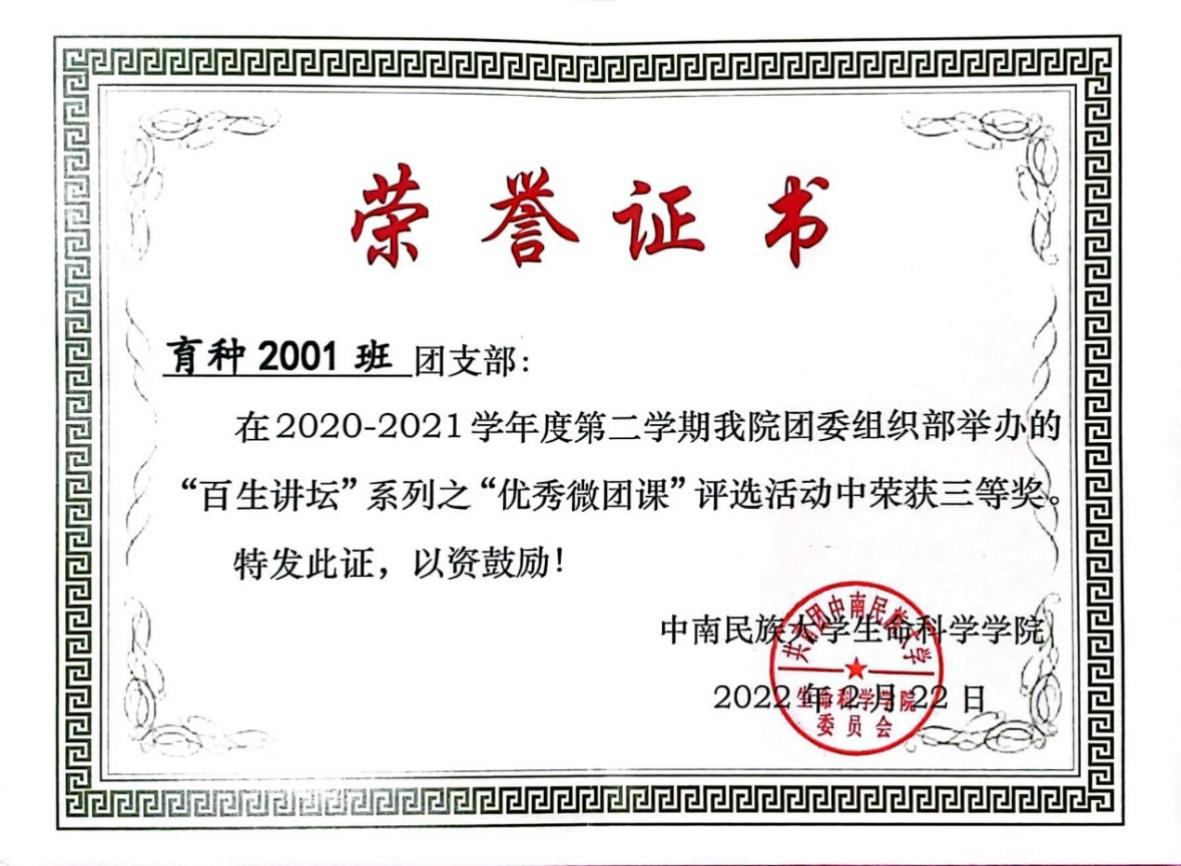 育种2001班的同学们拥有强烈的集体荣誉感,以高昂的精神面貌参与班风、学风建设。开通班级QQ号,分享班级同学课堂内外发生的趣事;在学院团委组织部举办的“百生讲坛”系列之“优秀微团课”评选活动中荣获三等奖……