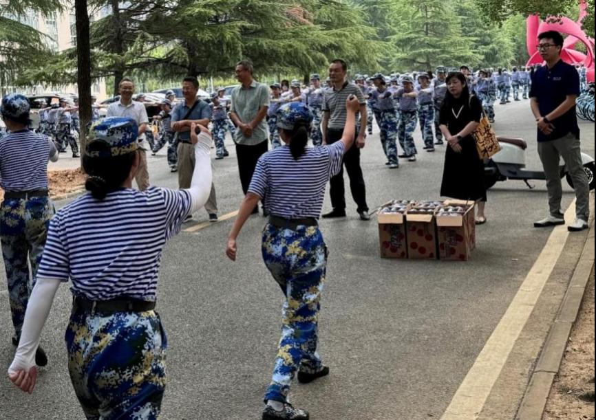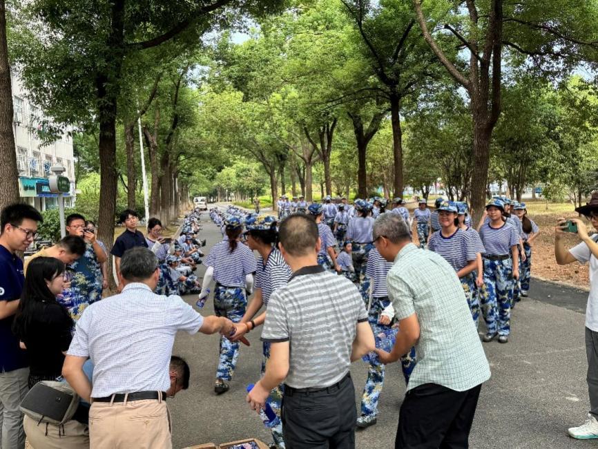 休整阶段,教官整队后,同学们秩序井然地接过学院领导递来的饮料。每一份饮品都承载着学院对同学们的深切关怀与殷殷期望,展现了学院对军训育人工作的高度重视。