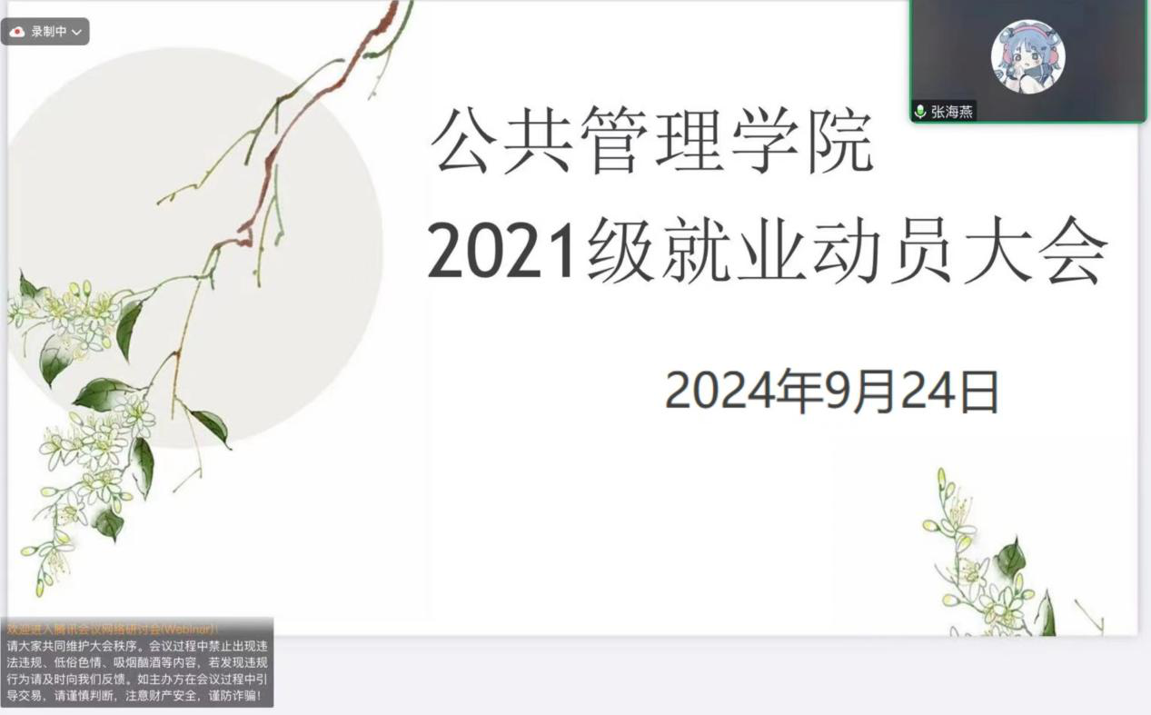 为促进我院大四本科生充分了解就业形势,引导同学们进行合理就业生学规划,助推高质量就业,公共管理学院于9月24日在线上召开2021级就业动员大会。本次大会由2021级辅导员张海燕老师担任主讲人。