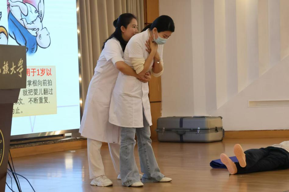 杨冰老师以通俗易懂的方式讲解了海姆立克急救法和心脏复苏术的应用,并用两个简单的口诀“剪刀石头布、拍五按五”来普及海姆立克急救法。此外,她还与同事一起现场演示了标准的海姆立克急救法和心脏复苏术。