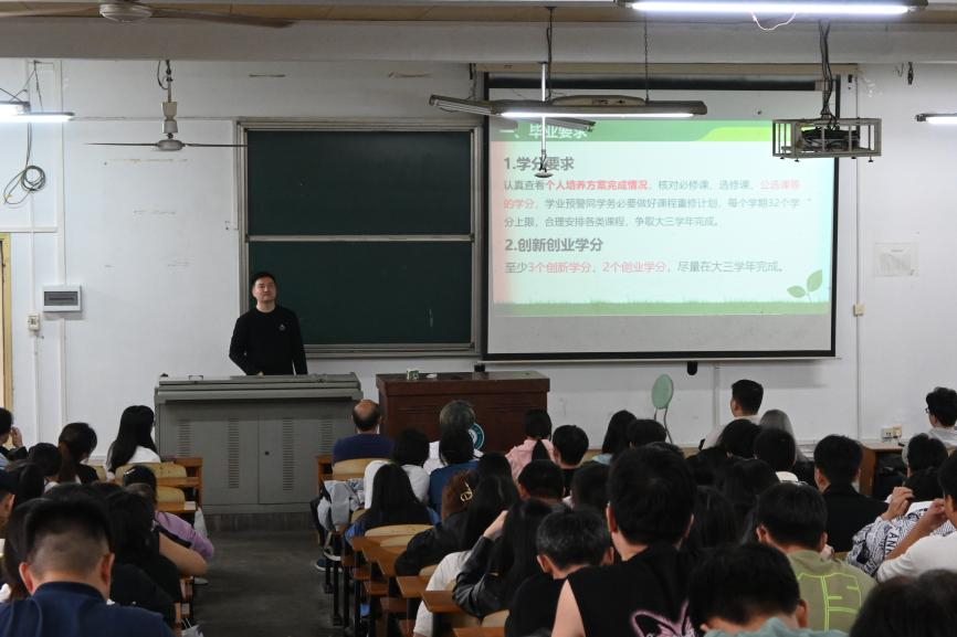在2022级学生年级大会上,黄晴老师从升学就业情况、毕业升学要求和思想意识学习等三个方面为同学们进行讲解介绍。他表示面对激烈的竞争现状和愈加严峻的就业形势,同学们应该端正心态、拒绝焦虑,开阔眼界、踔厉奋发,努力提升自身能力和综合素质,既要认真查看个人培养方案完成情况,更要合理规划好未来路径,为顺利毕业与就业打下良好基础。