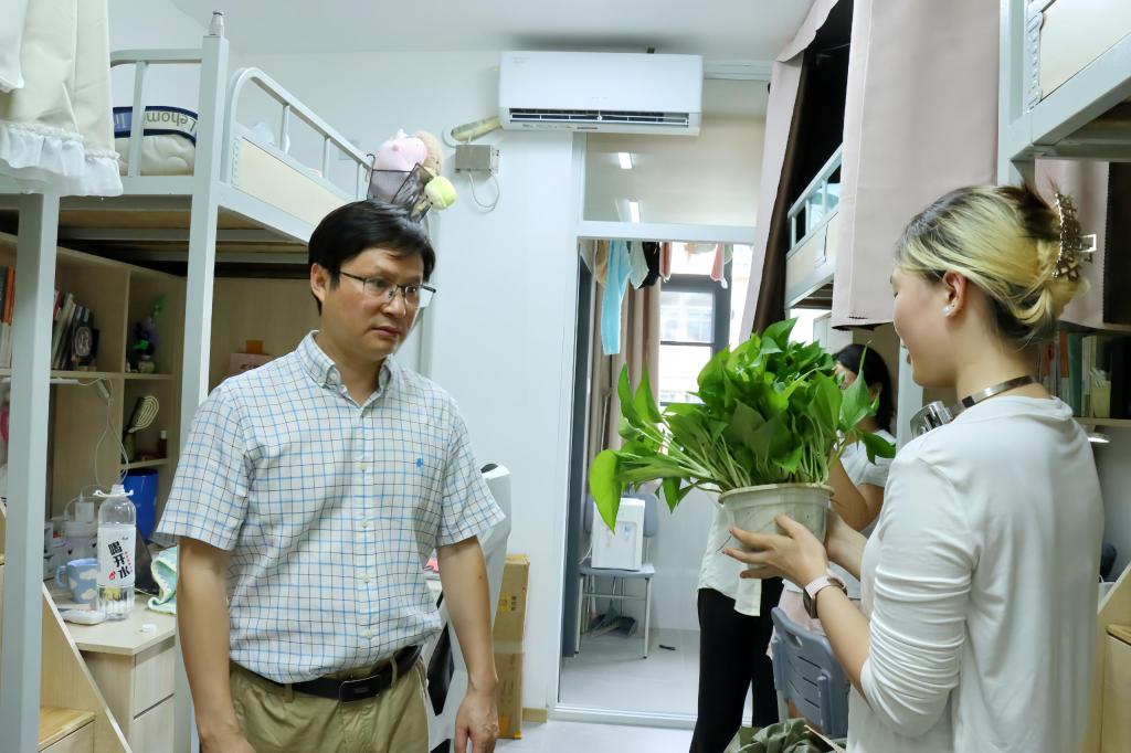 社会学2403班杨欣怡说到:“老师们在新学期来到宿舍慰问我们,还送我们绿植,让我很感动。在新学期,我会谨遵教诲,认真学习。”