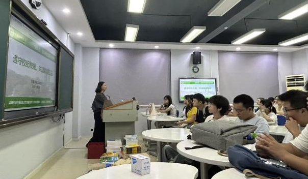 9月30日上午,洪山区反恐禁毒办禁毒社工王琴为新生开展“语你并肩·拒毒防艾”专题教育。王琴结合真实案例,深入浅出地讲解毒品的种类、危害及识别方法,同时普及了艾滋病的传播途径、预防措施与自我保护知识。讲座现场互动频繁,新生们积极提问,在热烈的交流中筑牢安全防线,树立“珍爱生命、远离危险”的意识。2025级本科生辅导员陈玲带领新生集中学习《学生手册》。陈玲围绕学籍管理、奖惩制度、校园安全、日常行为规范等核心内容进行解读。通过案例分析与要点梳理,新生们清晰掌握大学期间的行为准则,为未来的学习生活奠定了良好的纪律基础。