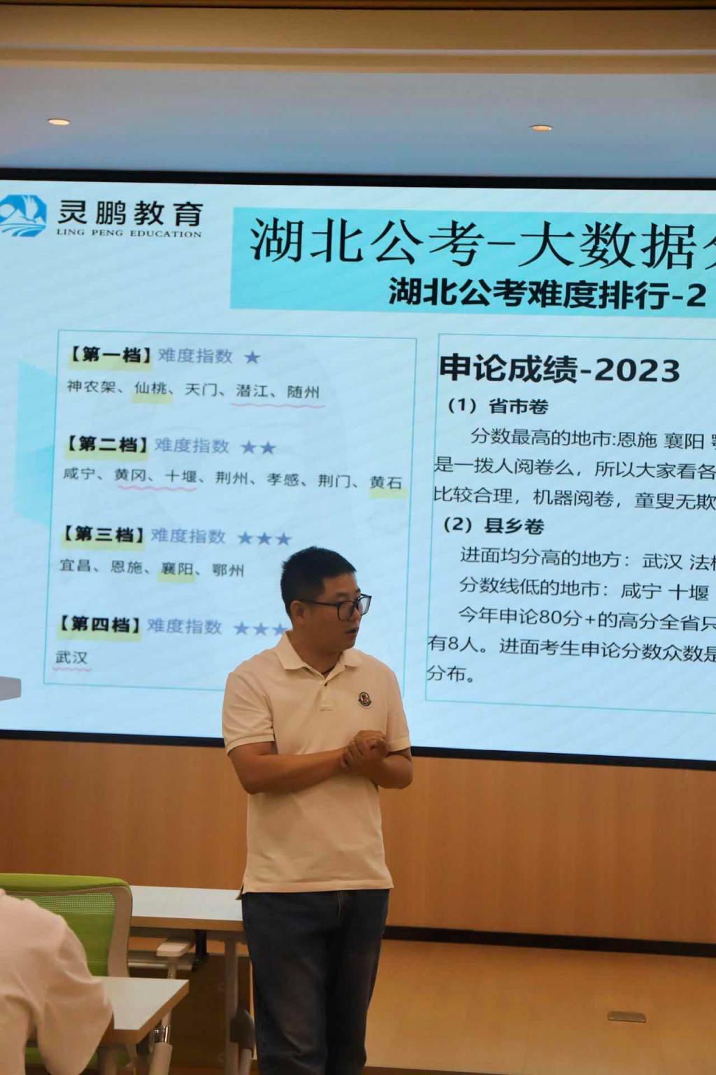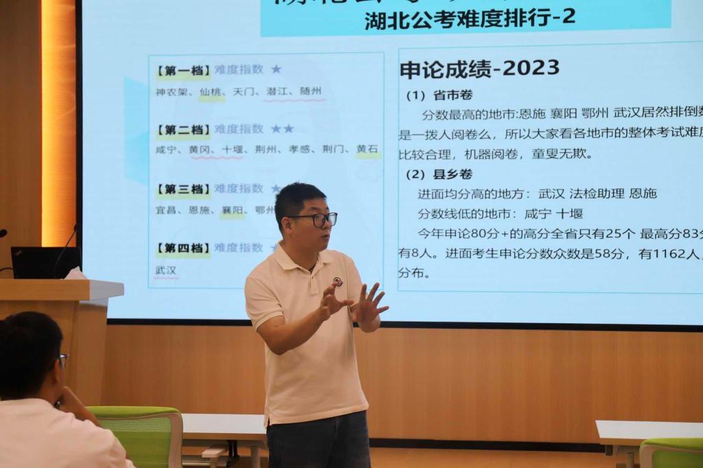 在具体展开2025公职类考试类别时,叶老师结合实际案例,详细讲解了不同类别考试的报考条件、招录流程和竞争态势。他特别对湖北公考的大数据进行了深入分析,通过展示历年招录人数、报考人数、录取分数线等数据,让辅导员们清晰地了解到湖北公考的竞争程度和变化趋势,为指导学生报考提供了有力的数据支持。
