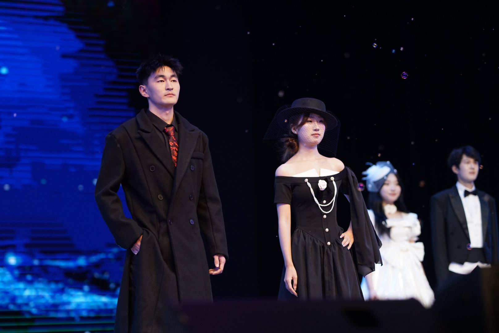 灯光聚焦,一道流动的青春风景线展开。礼仪组身着西装与礼服裙,步履从容,气韵优雅,展现属于时代的审美风貌与自信姿态,引发现场阵阵欢呼。