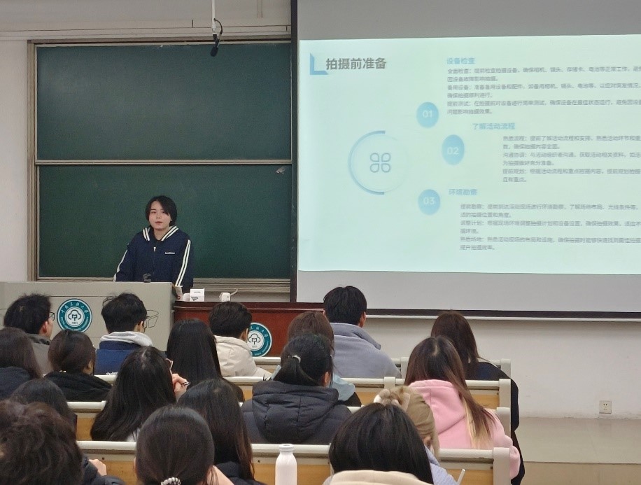 (文/王芝艳,图/朱炫秋)为进一步提升学生宣传工作水平,3月14日晚,我院在11栋207教室举办新闻摄影专题培训会。本次培训由记者团2022级孙义姗同学主讲,第十六届团委学生会主席团全体成员及各部门负责摄影与撰稿工作的同学参加。