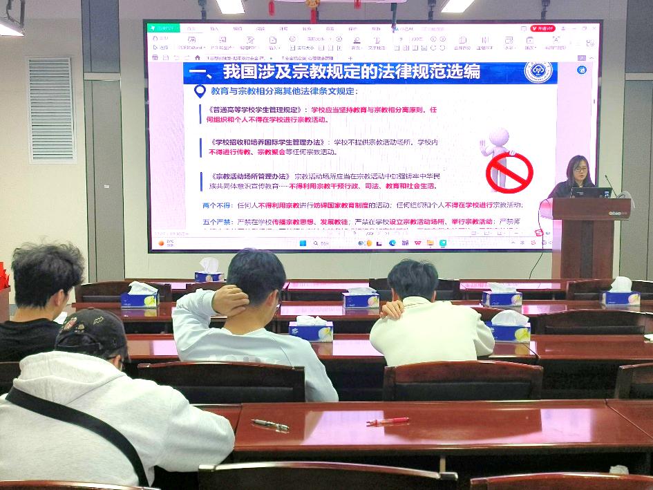 各班级在班会过程中,深入学习了我国宪法、教育法以及《宗教事务条例》等法律法规中关于宗教的规定,明确了教育与宗教相分离的原则以及学校内禁止宗教活动的具体要求,增强了学生在校园内坚守法律底线的意识。