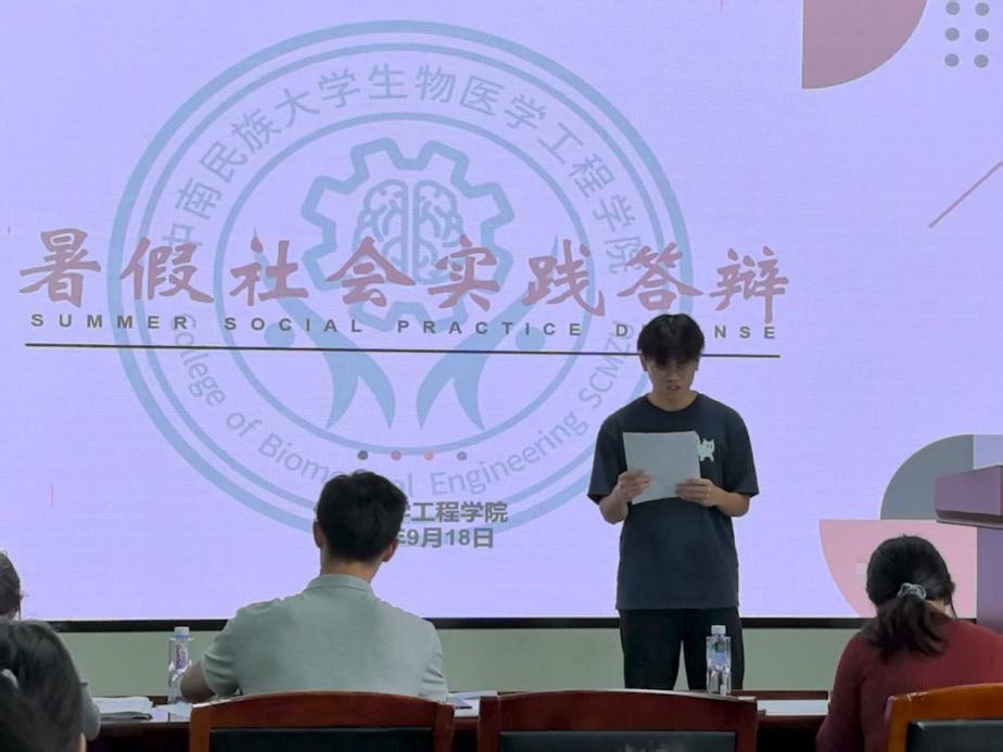 (文/洪靓,图/洪靓)为深入推进大学生素质教育,进一步提升学生创新思维、专业实践及综合应用能力,我院于 2025 年 9 月 18 日下午,在 16 栋 713 教室成功举办暑假社会实践成果汇报答辩会。本次活动由辅导员魏邱霞、郭骁,及研究生王东、杜思睿担任评委,生医2404班黄达颖主持。