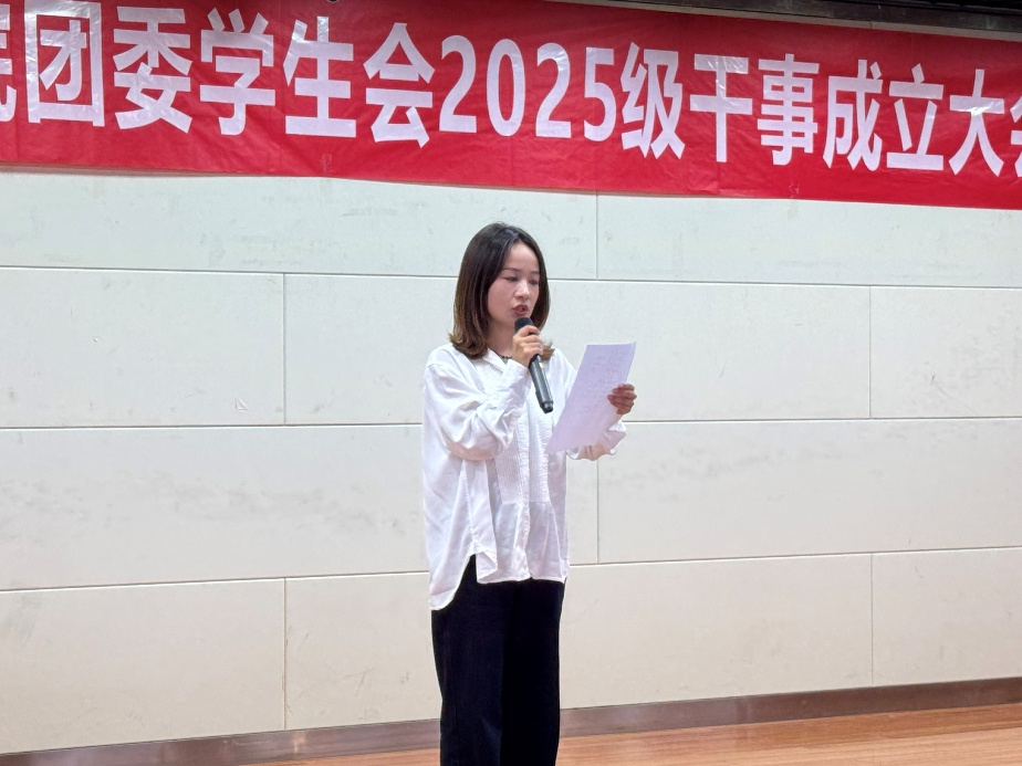 黄麒樾作为2025级干事代表发言。她表达了投身团学工作、助力组织发展的坚定决心,并向新生干事发出了三点倡议:一是永葆“服务之心”,以真诚和耐心对待同学,成为大家的贴心人;二是常怀“空杯之心”,主动向学长学姐学习经验方法,认真反思成长;三是秉持“团结之心”,强化团队协作意识,以热情与智慧书写团学新篇。