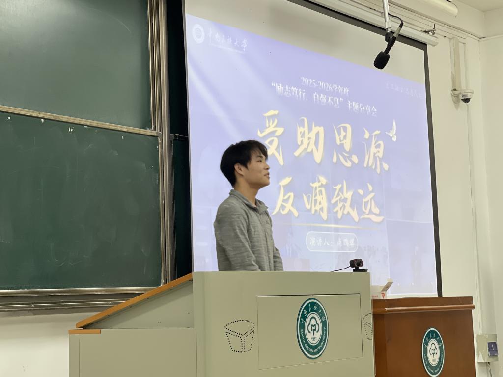 随后,同学们结合亲身经历,分别讲述了真挚感人的自立自强故事。其中2023级尚鹏辉同学以“受助思源,反哺致远”为主题,回顾了自身的成长。他坦言,正是得益于国家助学贷款、助学金等政策的扶持,他才拥有了逐梦前行的坚实基础。通过投身班助及学生会等实务工作,他更切身践行并深刻理解了青年的责任,其经历生动诠释了一段从困惑走向笃行的进取之路,获得了大家的一致认可。其他同学也分别结合各自经历,分享了自身成长故事。