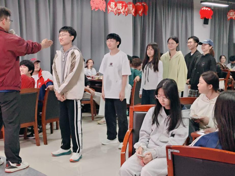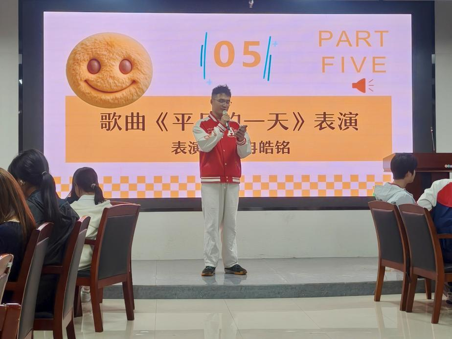 接下来,互动游戏与才艺表演轮番登场,同学们全情投入、各展所长,现场氛围在欢声笑语中持续升温。“三词成句”“正话反说”“加字游戏”“动作反做”等互动游戏接连进行,同学们积极参与、默契配合,热闹的氛围让同学们的距离快速拉近。才艺表演同样精彩纷呈,冉皓铭同学演唱的《平凡的一天》温暖治愈,杨帆同学和郑曦同学合唱的《晴天》满是青春气息,现场氛围轻松愉悦。