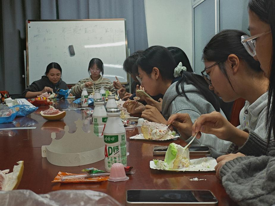 活动在温馨的集体庆生环节中结束。全体成员齐唱生日歌,共同分享蛋糕,部分同学还即兴献唱,用歌声传递喜悦。欢声笑语不仅驱散了学业压力,更深化了同窗情谊,为在场的每位同学都留下了一段温暖而珍贵的记忆。