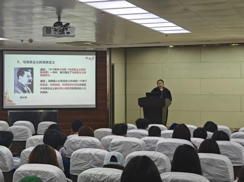 陈卉丹围绕主题系统讲解,首先立足我国统一多民族国家的基本国情,点明我国民族分布“大杂居、小聚居、交错杂居”的特点,剖析这一格局的形成与各民族政治经济交往、人口迁徙、朝代更迭等因素的深层关联,同时介绍了少数民族地区丰富的林业、农业、矿藏与旅游资源,帮助学生理解各民族在资源开发中形成的相互依存关系。随后,陈卉丹梳理中华民族交融历史脉络,从夏朝奠定华夏族核心基础,到汉代形成中华民族凝聚核心,再到各民族长期的大交流、大融合,清晰展现汉族与少数民族相互吸收、彼此成就的轨迹,并深入阐释费孝通先生“中华民族多元一体格局”理论的内涵,解读中华民族意识觉醒的民主革命、团结建设、民族复兴三个关键阶段。