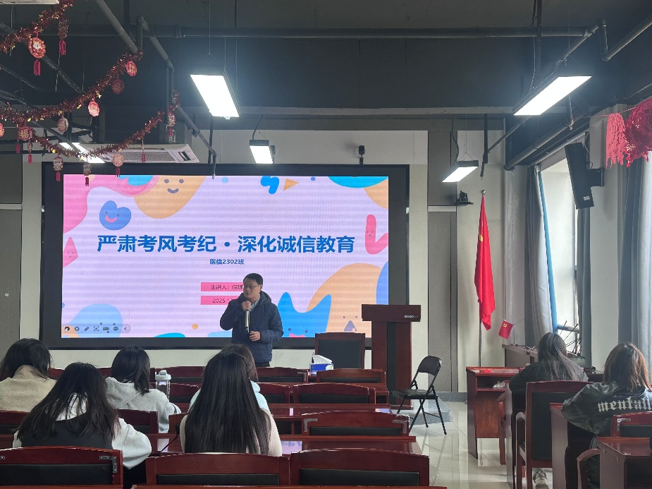 医信2302班班导师王清华向全体同学作出三点强调:一是诚信应考,严守考风考纪,杜绝各类作弊行为;二是增强防范意识,警惕电信诈骗,守护自身财产安全;三是遵守校规校纪,严禁未经许可私自外出、夜不归宿。