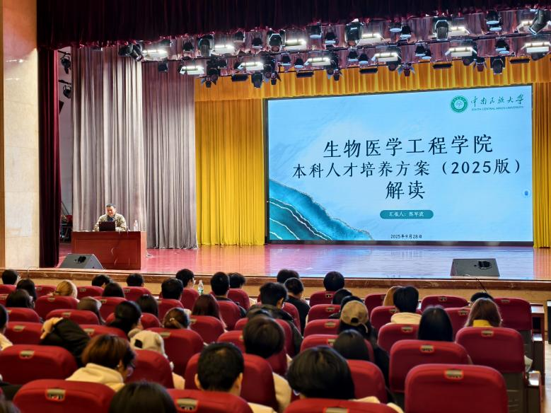 随后,陈军波副院长围绕专业概况、培养目标、课程与学分结构、选课安排及课程模块设置等方面,为新生系统解读了2025级培养方案。他从专业发展方向出发,详细说明了我院三个细分专业的区别与特色,并对应阐释了课程设计的逻辑与教学内容。陈院长还对比了2025级与2024级培养方案的调整,指出新版方案在适当减少毕业学分要求的同时,更加注重学生综合素质的提升。他鼓励同学们增强对生物医学工程专业的认同与热爱,扎实打好专业基础,实现全面发展。