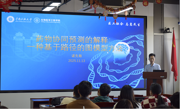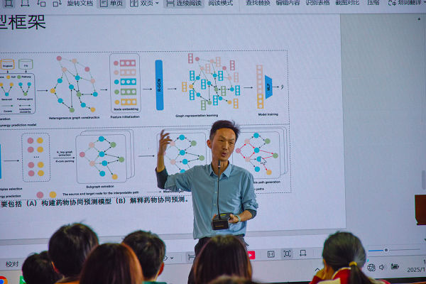谌先敢老师以“基于路径的图模型方法在药物协同预测中的应用”为主题进行汇报。他介绍了模型如何通过分析药物-靶点-通路之间的复杂关系,实现协同效应的预测,并展示了模型在抗癌药物组合筛选中的验证结果,为精准用药提供了新的思路。