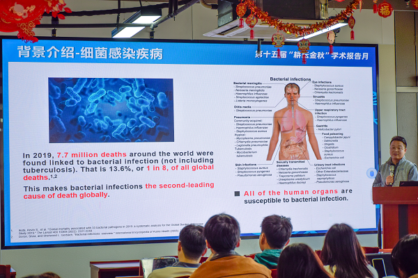 向一鸣老师围绕“抗菌生物材料研究”展开报告。他重点介绍了团队在金属纳米抗菌、可降解高分子材料及多功能复合材料方面的设计理念,分享了材料在抑菌、抗感染及组织修复中的实验数据与应用前景,揭示了抗菌材料在临床创面管理中的潜在价值。