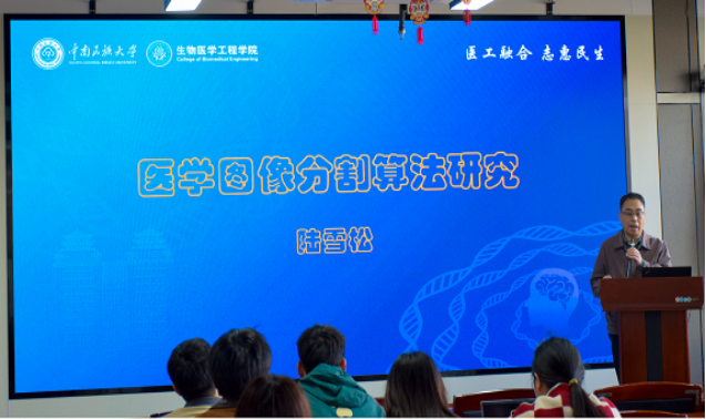 在教师学术报告环节,陆雪松老师以“医学图像分割算法研究”为主题,介绍了深度学习在医学影像诊断、病灶识别及结构边界分割中的关键作用。他提到团队近期在多尺度特征融合、轻量化网络及大模型辅助分割方面的探索,并展示了技术在肿瘤识别与脑结构分析中的应用成果。