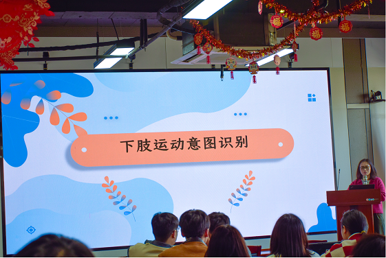 周慧老师以“下肢运动意图识别”为主题进行报告。她重点介绍了团队利用肌电信号(EMG)与惯性传感器(IMU)融合的运动识别技术,结合深度学习模型实现对下肢动作的实时预测,并展示其在智能外骨骼控制与康复训练中的应用潜力。