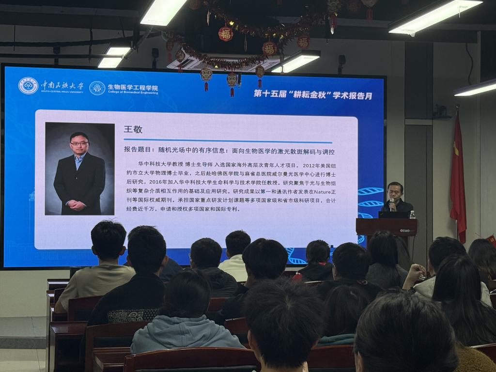 (文/何庆 图/陈卉丹)2025年11月14日下午,我院在16号教学楼713会议室举办“耕耘金秋”学术报告会,特邀华中科技大学王敬教授作题为《随机光场中的有序信息:面向生物医学的激光散斑解码与调控》的学术报告。此次讲座由院长阳小飞教授主持,部分导师和2024级、2025级研究生参加。